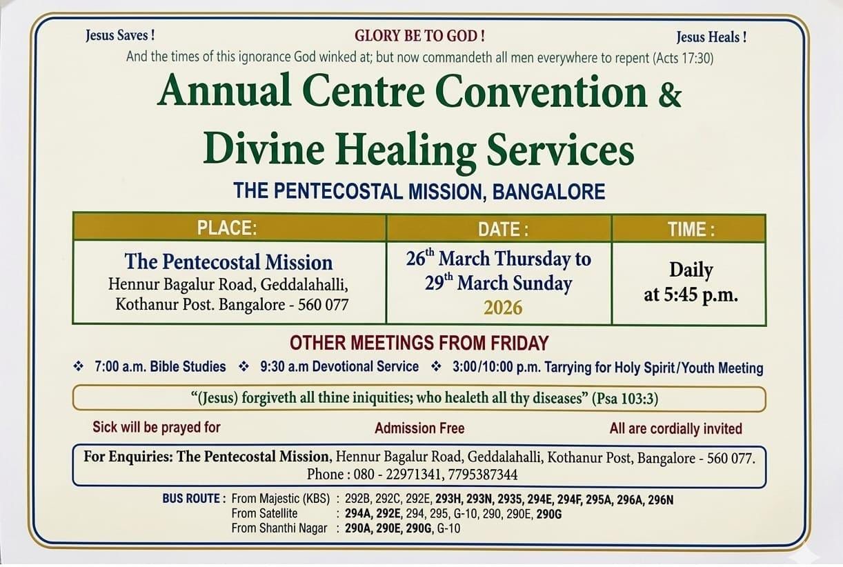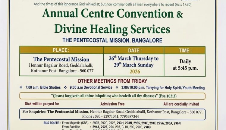 ബെംഗളൂരു: ദി പെന്തെക്കൊസ്ത് മിഷൻ സഭയുടെ കർണാടകയിലെ ഏറ്റവും വലിയ ആത്മീയസംഗമമായ ബെംഗളൂരു സെന്റർ കൺവൻഷൻ മാർച്ച് 26 വ്യാഴം മുതൽ 29 ഞായർ വരെ ഗധലഹള്ളി ഹെന്നൂർ – ബാഗലൂർ റോഡിൽ സെന്റ് മൈക്കിൾസ് സ്കൂളിന് സമീപമുള്ള റ്റി.പി.എം കൺവൻഷൻ സെന്ററിൽ നടക്കും.
