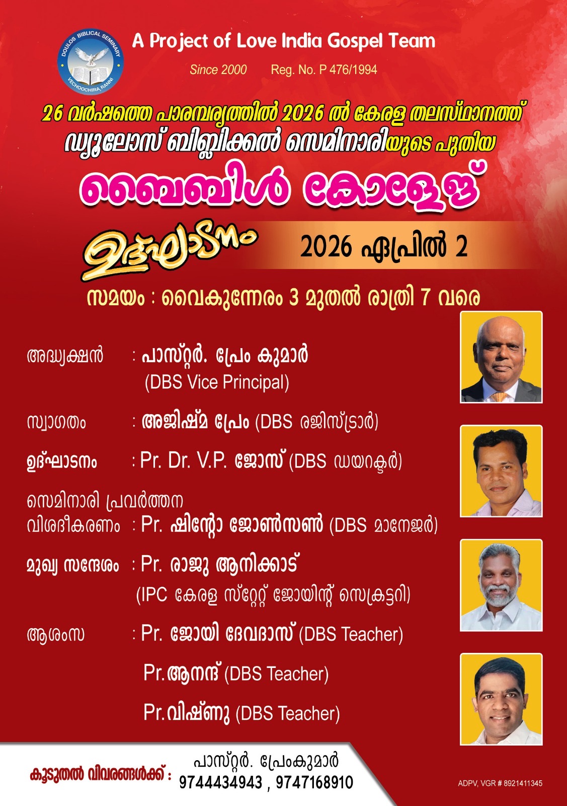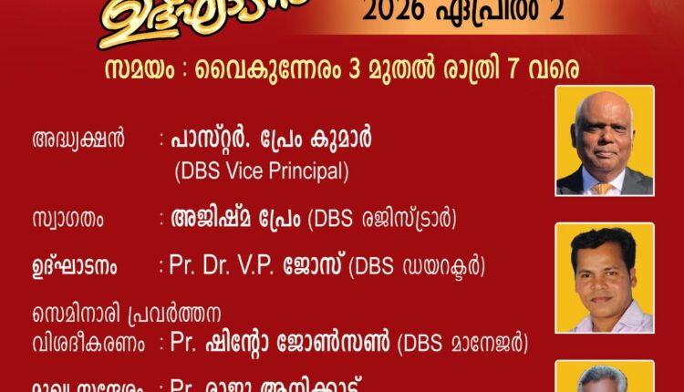 വെച്ചൂച്ചിറ: ഡ്യൂലോസ് ബിബ്ലിക്കൽ സെമിനാരിയുടെ നേതൃത്വത്തിൽ തിരുവനന്തപുരം ജില്ലയിലെ ഒറ്റശേഖരമംഗലത്തു ആരംഭിക്കുന്ന പുതിയ ബൈബിൾ സെമിനാരിയുടെ ഉദ്ഘാടനം ഏപ്രിൽ 2 ന് വൈകിട്ട് 3 മണി മുതൽ നടക്കും. കോളേജ് ഡയറക്ടർ പാസ്റ്റർ ഡോ. വി. പി. ജോസ് ഉദ്ഘാടനം നിർവഹിക്കും. ഐ.പി.സി. കേരള സ്റ്റേറ്റ് ജോയിന്റ് സെക്രട്ടറി പാസ്റ്റർ രാജു ആനിക്കാട് മുഖ്യ സന്ദേശം നൽകും. സെമിനാരിയുടെ പ്രവർത്തന വിശദീകരണം പാസ്റ്റർ ഷിന്റോ ജോൺസൻ (DBS മാനേജർ ) നൽകും. പാസ്റ്റർ പ്രേം കുമാർ അധ്യക്ഷത വഹിക്കും.