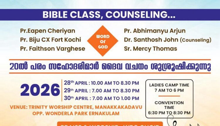 എറണാകുളം: വേൾഡ് പെന്തെക്കോസ്തു കൗൺസിലിൻ്റെ ആഭിമുഖ്യത്തിൽ വിഷൻ ബിയോണ്ട് 2030 എന്ന ലക്ഷ്യത്തോടെ ലേഡിസ് ക്യാമ്പും, കൺവൻഷനും 2026 ഏപ്രിൽ 28 മുതൽ 30 വരെ എറണാകുളം വണ്ടർല പാർക്കിനു സമീപം മണക്കക്കടവ് വർഷിപ്പ് സെൻ്ററിൽ നടക്കും.