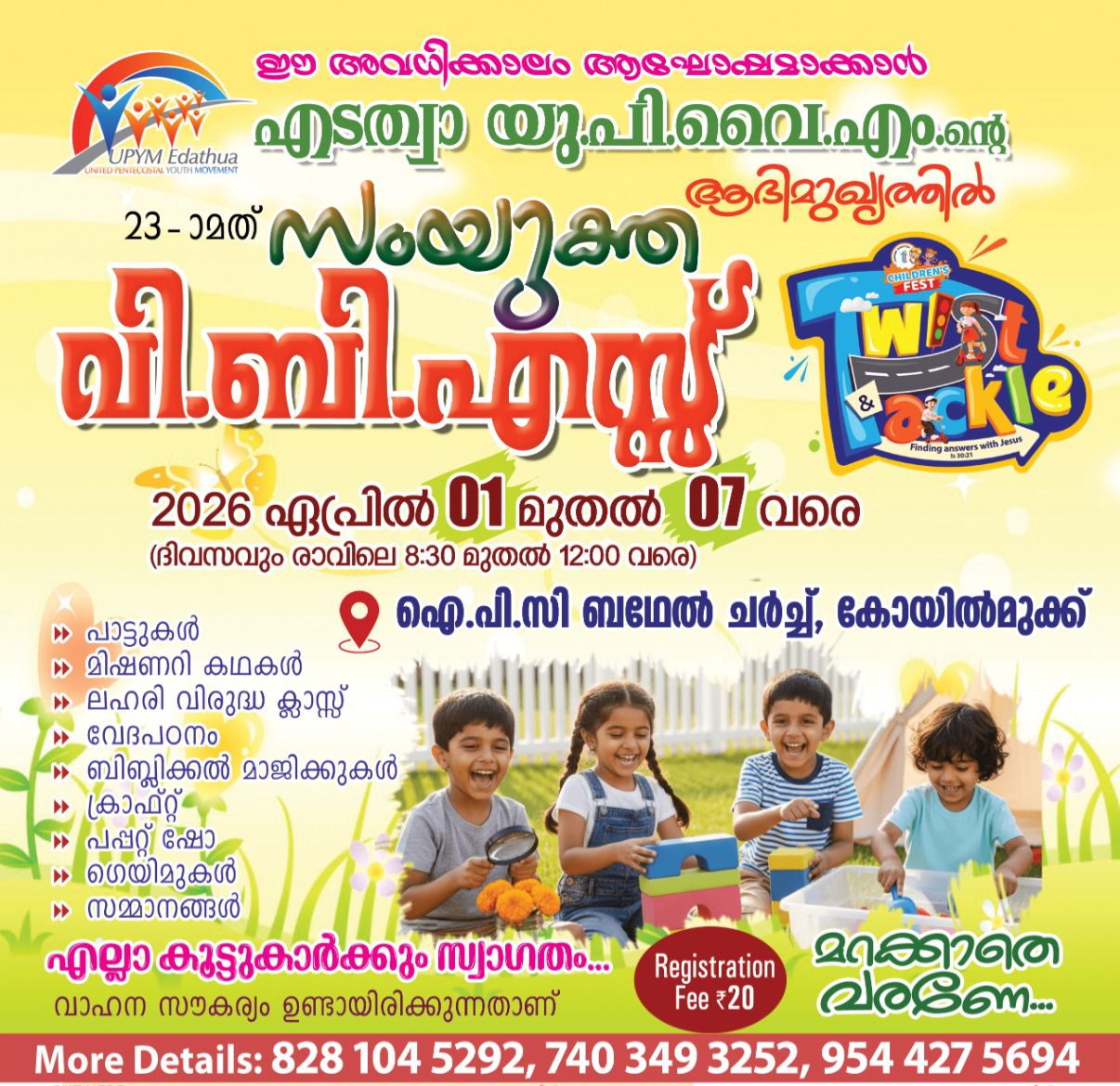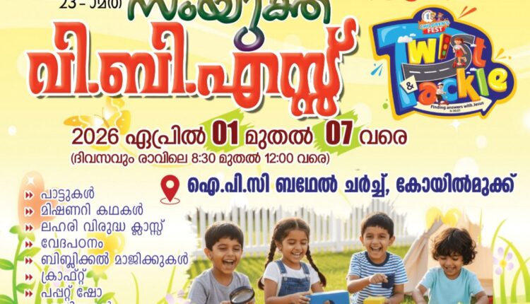 എടത്വാ: യുണൈറ്റഡ് പെന്തക്കോസ്തൽ യൂത്ത് മൂവ്മെന്റിന്റെ (UPYM) ആഭിമുഖ്യത്തിൽ 23-ാമത് സംയുക്ത വി.ബി.എസ് നാളെ ഏപ്രിൽ 1 മുതൽ 7 ചൊവ്വ വരെ കോയിൽമുക്ക് ഐ.പി.സി ബഥേൽ സഭയിൽ വെച്ച് നടക്കും. ദിവസവും രാവിലെ 8.30 മുതൽ ഉച്ചയ്ക്ക് 12 വരെയാണ് സമയം.