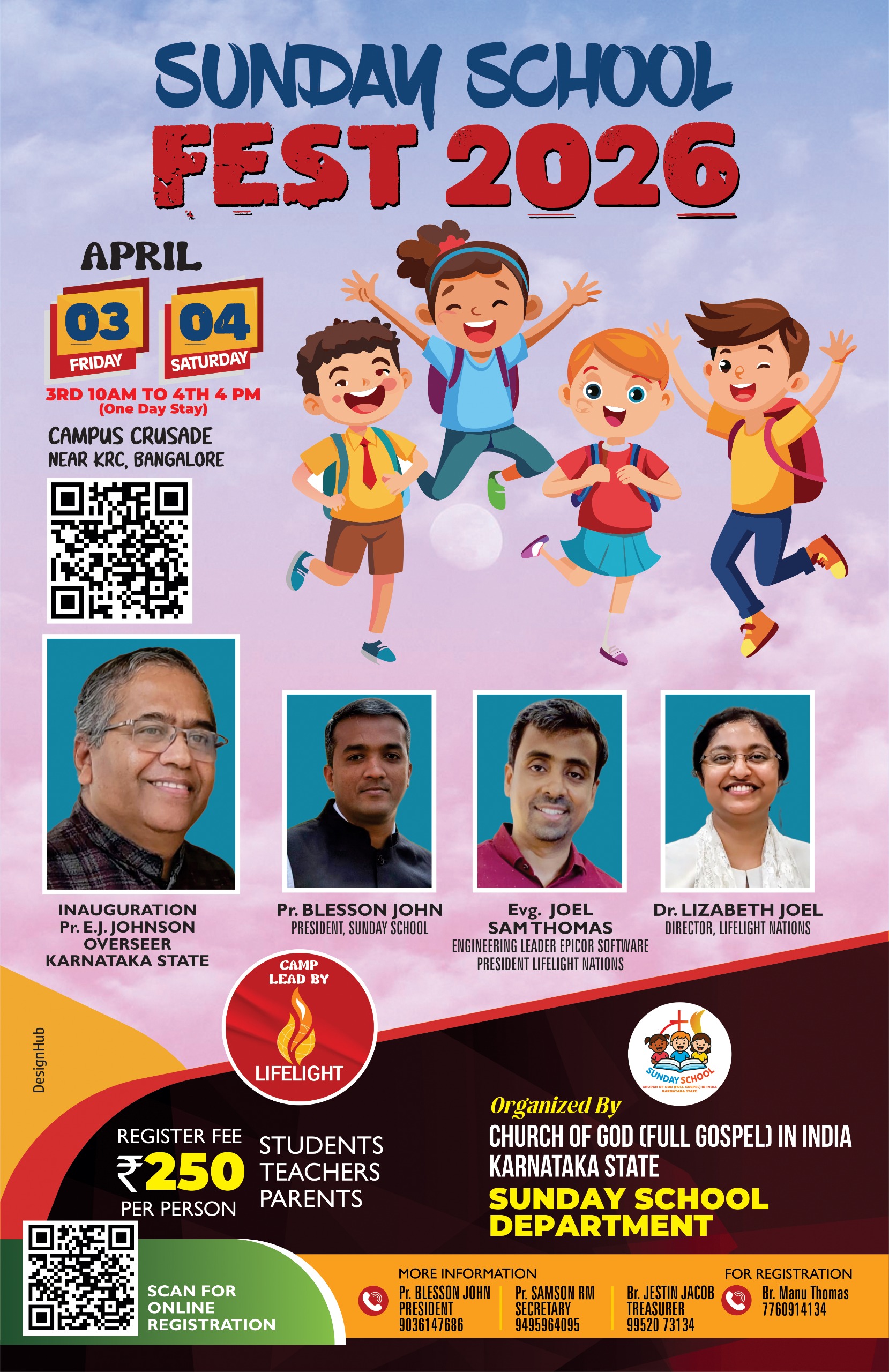 ബെംഗളൂരു: ചർച്ച് ഓഫ് ഗോഡ് കർണ്ണാടക സ്റ്റേറ്റ് സൺഡേ സ്കൂൾ ഡിപ്പാർട്ടുമെന്റിന്റെ ദ്വിദിന പ്രോഗ്രാം 2026 ഏപ്രിൽ 3, 4 തീയതികളിൽ ബാംഗ്ലൂർ KRC ക്ക് സമീപമുള്ള ക്യാമ്പസ് ക്രൂസൈഡ് ക്യാമ്പ് സെന്ററിൽ നടക്കും. രാവിലെ 9-ന് ആരംഭിക്കുന്ന രജിസ്ട്രേഷനോടു കൂടി പോഗ്രാമുകൾ ആരംഭിക്കും. സ്റ്റേറ്റ് ഓവർസിയർ പാസ്റ്റർ ഇ.ജെ. ജോൺസൺ ഉദ്ഘാടനം ചെയ്യും. ലൈഫ് ലൈറ്റ് ടീം ക്ലാസുകൾ നയിക്കും. രണ്ട് ദിവസത്തെ ഭക്ഷണവും താമസസൗകര്യവും ക്രമീകരിച്ചിരിക്കുന്നതായി ഭാരവാഹികൾ അറിയിച്ചു. സൺഡേ സ്കൂൾ ഡയറക്ടർ പാസ്റ്റർ ബ്ലസ്സൻ ജോൺ, സെക്രട്ടറി പാസ്റ്റർ സാംസൺ ആർ.എം., ട്രഷറാർ ബ്രദർ ജസ്റ്റിൻ ജേക്കബ്, ബ്രദർ മനു തോമസ് (രജിസ്ട്രേഷൻ കോർഡിനേറ്റർ) എന്നിവർ നേതൃത്വം നൽകും.