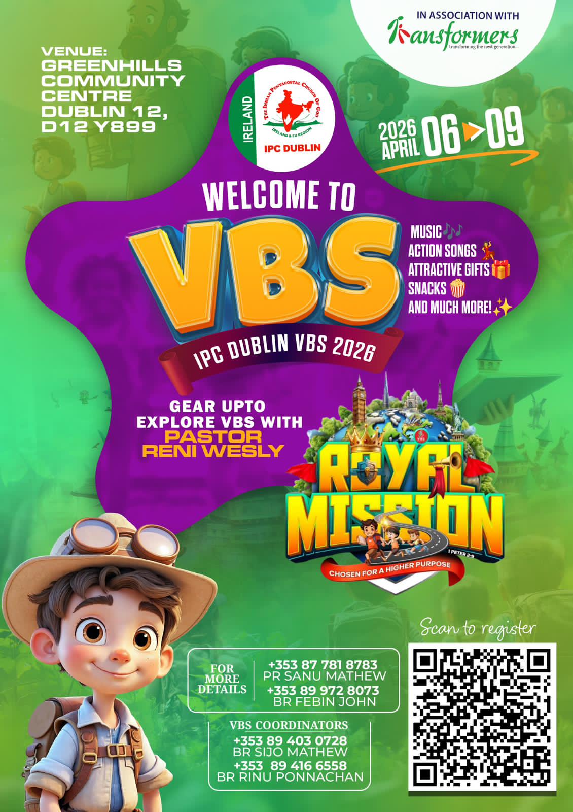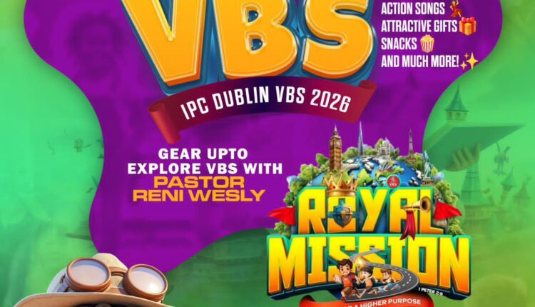 ഡബ്ലിൻ: ഐപിസി ഡബ്ലിനും ട്രാൻസ്ഫോർമേഴ്സ് ടീമും സംയുക്തമായി സംഘടിപ്പിക്കുന്ന കുട്ടികൾക്കായുള്ള വി.ബി.എസ് (വേക്കേഷൻ ബൈബിൾ സ്കൂൾ) 2026 ഏപ്രിൽ 6 മുതൽ 9 വരെ ഡബ്ലിനിലെ ഗ്രീൻഹിൽസ് കമ്മ്യൂണിറ്റി സെന്ററിൽ നടക്കും. ദിവസവും രാവിലെ 9.30 മുതൽ ഉച്ചയ്ക്ക് 1 മണിവരെ പരിപാടികൾ ഉണ്ടായിരിക്കും.