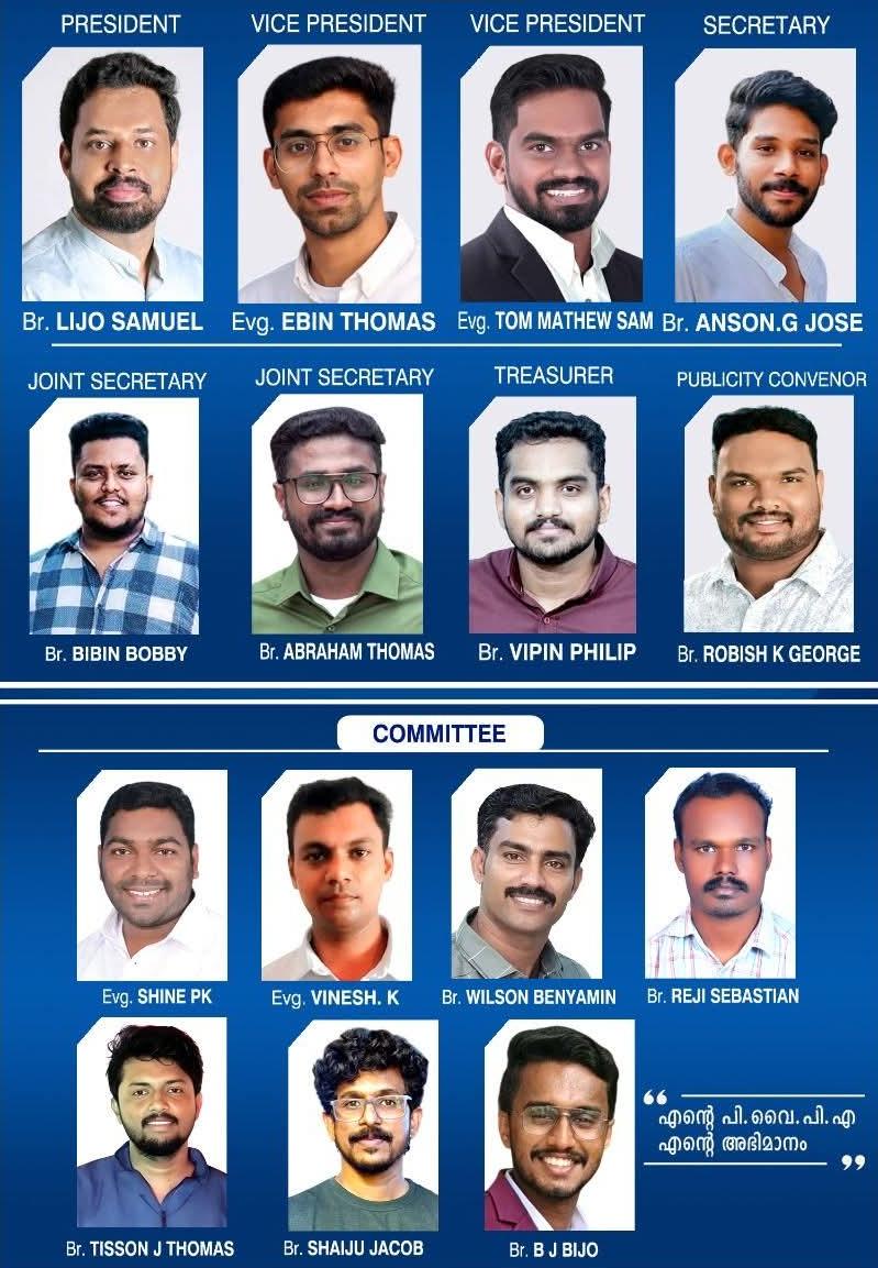 തിരഞ്ഞെടുപ്പിലൂടെ ബ്രദർ ലിജോ സാമുവേൽ പ്രസിഡന്റായും, ഇവാ. എബിൻ തോമസ്, ഇവാ. ടോം മാത്യു എന്നിവർ വൈസ് പ്രസിഡന്റുമാരായും തിരഞ്ഞെടുക്കപ്പെട്ടു. ബ്രദർ ആൻസൺ ജി ജോസ് സെക്രട്ടറിയായും, ബ്രദർ ബിബിൻ ബോബി, ബ്രദർ എബ്രഹാം തോമസ് എന്നിവർ ജോയിന്റ് സെക്രട്ടറിമാരായും തെരഞ്ഞെടുക്കപ്പെട്ടു. ബ്രദർ വിപിൻ ഫിലിപ്പ് ട്രഷററായും, റോബിഷ് കെ ജോർജ് പബ്ലിസിറ്റി കൺവീനറായും ചുമതലയേറ്റു.
