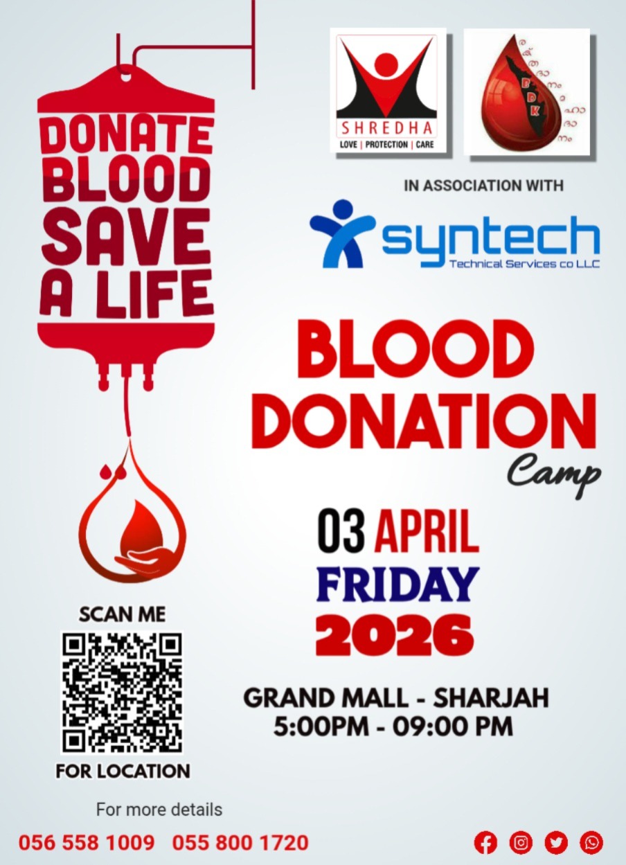 ശ്രദ്ധയുടെ നേതൃത്വത്തിൽ നടക്കുന്ന രക്തദാന ക്യാമ്പ് ഏപ്രിൽ മൂന്നിന് ഷാർജ ഗ്രാൻഡ് മാളിൽ