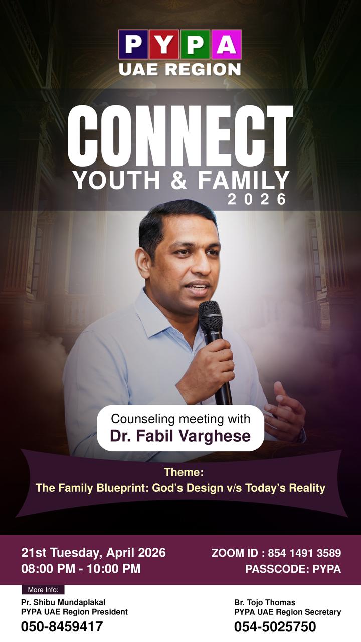 പി.വൈ.പി. എ യു.എ.ഇ റീജിയന്റെ ആഭിമുഖ്യത്തിൽ പ്രശസ്ത സൈക്കോളജിസ്റ്റ് ഡോ. ഫാബിൽ വർഗീസ് നേതൃത്വം നൽകുന്ന ‘CONNECT 2026’ എന്ന കൗൺസിലിംഗ് മീറ്റിംഗ് 2026 ഏപ്രിൽ 21 ന് സൂം പ്ലാറ്റ്ഫോമിൽ വച്ച് നടത്തപ്പെടുന്നു.
