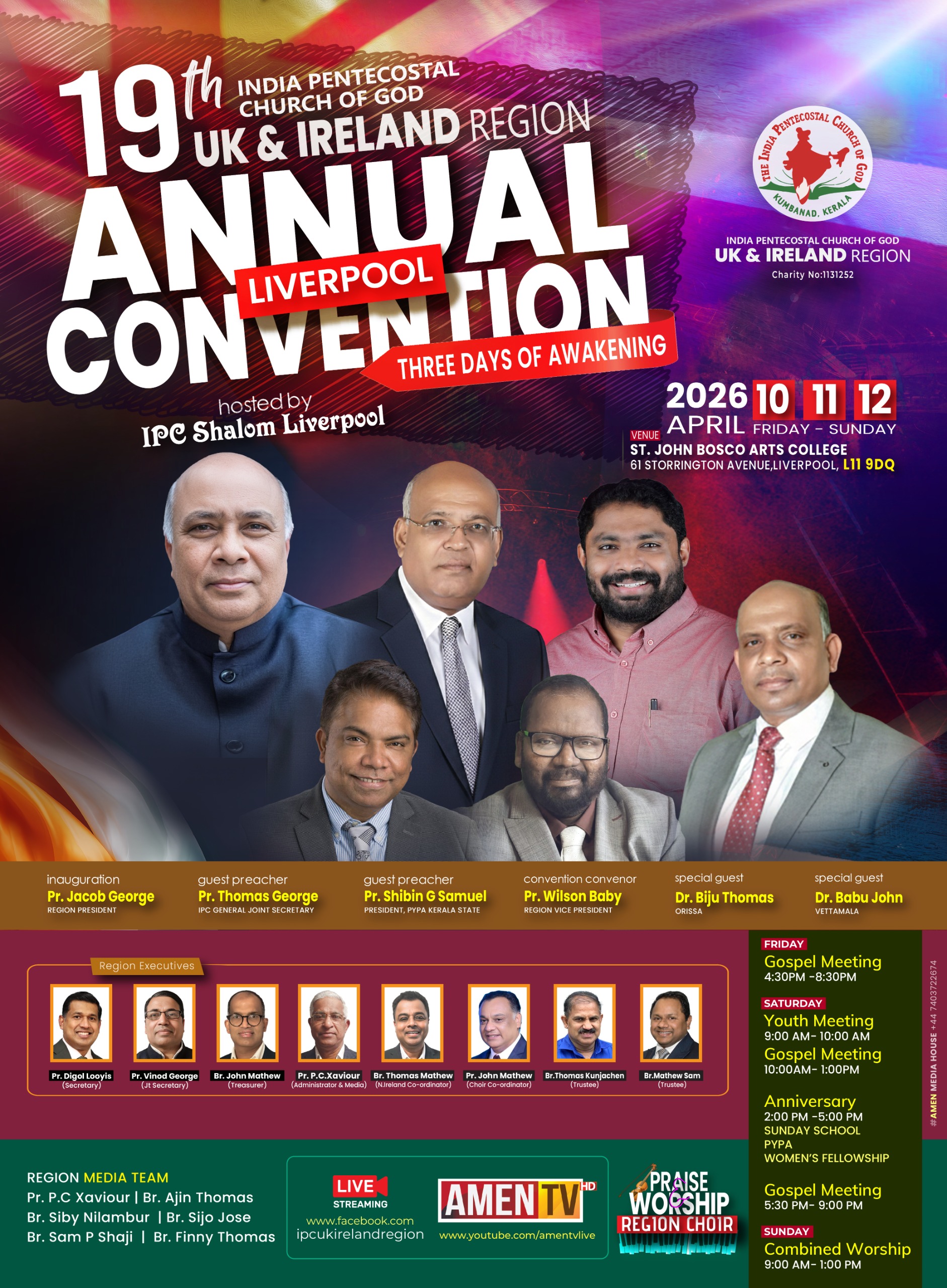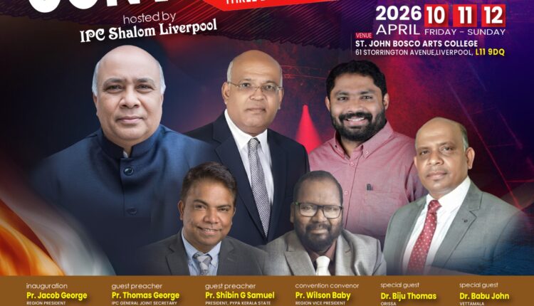 ലിവർപൂൾ: ആഗോള പെന്തെക്കോസ്ത് സമൂഹത്തിലെ പ്രഗത്ഭരായ രണ്ടു വചന പ്രഭാഷകർ ഒരേ വേദിയിൽ കൈകോർക്കുന്ന ഐപിസി യുകെ ആന്ഡ് അയര്ലന്ഡ് റീജിയണ് ലിവർപൂള് കണ്വന്ഷന് തയാറെടുപ്പുകള് അവസാന ഘട്ടത്തിലെത്തി. ഏപ്രിൽ 10 മുതൽ 12 വരെ ലിവർപൂളിലെ സെന്റ് ജോൺ ബോസ്കോ ആർട്സ് കോളേജിലാണ് (St. John Bosco Arts College, 61 Storrington Avenue, Liverpool, L11 9DQ) ഐപിസി യുകെ & അയർലണ്ട് റീജിയന്റെ 19-ാമത് വാർഷിക കൺവൻഷന് നടക്കുന്നത്. ഐപിസി ജനറൽ ജോയിന്റ് സെക്രട്ടറി പാസ്റ്റർ തോമസ് ജോർജും, കേരള പി.വൈ.പി.എ (PYPA) പ്രസിഡന്റ് പാസ്റ്റർ ഷിബിൻ ജി. സാമുവലുമാണു മുഖ്യ പ്രഭാഷകര്.
