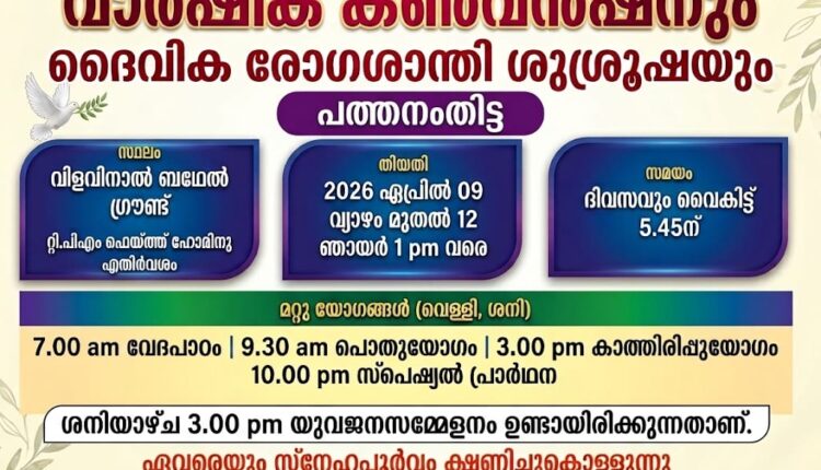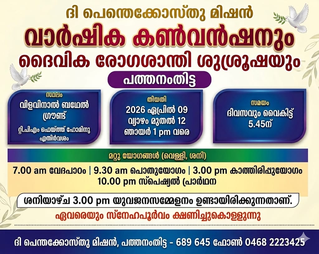 പത്തനംതിട്ട: ദി പെന്തെക്കൊസ്ത് മിഷൻ പത്തനംതിട്ട സെന്റർ വാർഷിക കൺവൻഷൻ ഇന്ന് ഏപ്രിൽ 9 മുതൽ 12 ഞായർ വരെ സെന്റർ ഫെയ്ത്ത് ഹോമിന് എതിർവശമുള്ള വിളവിനാൽ ബെഥേൽ ഗ്രൗണ്ടിൽ നടക്കും.