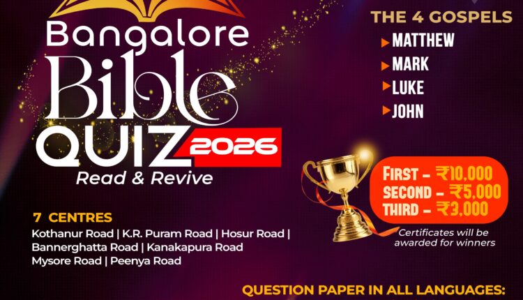 ബെംഗളൂരു: കർണാടകയിലെ പെന്തെക്കൊസ്ത് ശുശ്രൂഷകരുടെ ആത്മീയ കൂട്ടായ്മയായ ഹെവൻലീ ആർമീസ് ആഭിമുഖ്യത്തിൽ ഏപ്രിൽ 26ന് വൈകിട്ട് 4 മുതൽ 5 വരെ ബാംഗ്ലൂർ ബൈബിൾ ക്വിസ് മത്സരം നടത്തും.
