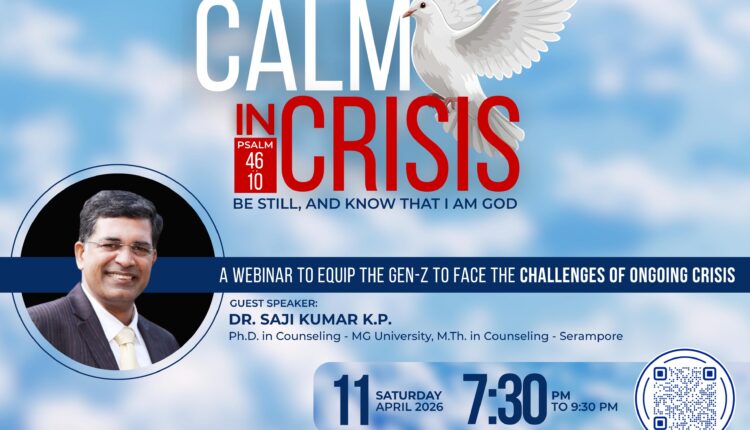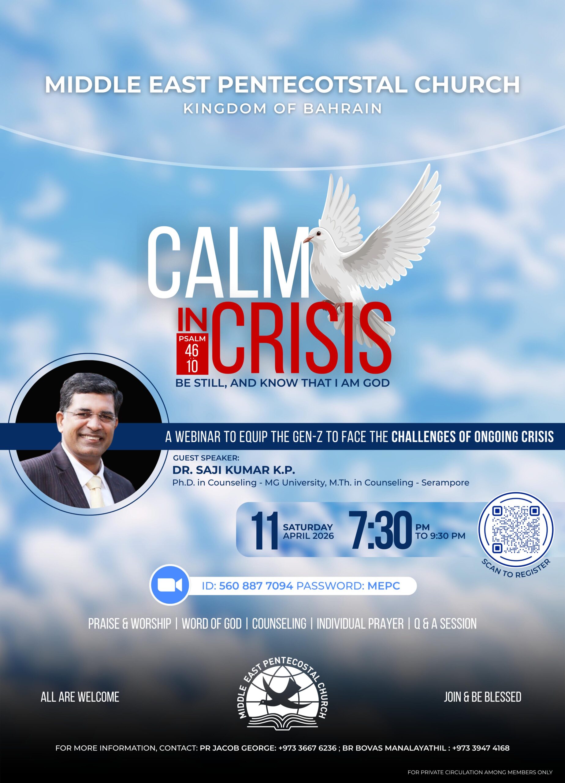 ബഹ്റൈനിലെ ഉപദേശ ഐക്യമുള്ള പതിനൊന്ന് പെന്തക്കോസ്ത് സഭകളുടെ കൂട്ടായ്മയായ മിഡിൽ ഈസ്ററ് പെന്തക്കോസ്ത് ചർച്ച് (MEPC), മധ്യ പൂർവേഷ്യയിലെ യുദ്ധ സാഹചര്യം നിമിത്തം മാനസിക വൈകാരിക പ്രതിസന്ധികൾ നേരിടുന്ന വിദ്യാർത്ഥികൾക്കായി ‘Calm in Crisis ‘എന്ന പേരിൽ വെബിനാർ സംഘടിപ്പിക്കുന്നു.. ഏപ്രിൽ 11 ശനിയാഴ്ച ബഹ്റൈൻ സമയം വൈകുന്നേരം 7.30 മുതൽ 9.30 വരെ (UAE സമയം വൈകുന്നേരം 8.30 മുതൽ 10.30 വരെ) സൂം പ്ലാറ്റുഫോമിൽ ക്രമീകരിച്ചിരിക്കുന്ന വെബിനാറിൽ പ്രശസ്ത വേദാധ്യാപകനും കൗൺസലറുമായ ഡോക്ടർ സജി കുമാർ കെ. പി. റിസോഴ്സ് പേഴ്സൺ ആയിരിക്കും. നിലവിലെ പ്രതിസന്ധി നിമിത്തം പരീക്ഷകൾ റദ്ദു ചെയ്യപ്പെടുകയും ഉപരിപഠന സാദ്ധ്യതകൾക്ക് വെല്ലുവിളി ഉയർത്തപ്പെടുകയും ചെയ്യുന്ന സാഹചര്യത്തിൽ വിദ്യാർത്ഥികൾക്കും മാതാപിതാക്കൾക്കും മാനസികവും വൈകാരികവുമായ പിന്തുണ വേദപുസ്തകാടിസ്ഥനത്തിൽ നൽകുക എന്നതാണ് ഈ വെബിനാറിന്റെ ഉദ്ദേശം. വിദ്യാർത്ഥികളെയും മാതാപിതാക്കളെയും കൂടാതെ സൺഡേ സ്കൂൾ അധ്യാപകർ, യുവജന പ്രവർത്തകർ, സഭാ മൂപ്പന്മാർ എന്നിത്യാദി വിവിധ ശുശ്രൂഷകളിൽ ഏർപ്പെട്ടിരിക്കുന്നവർ ഈ വെബിനാറിൽ പങ്കെടുക്കുന്നത് ഇത്തരം പ്രതിസന്ധികളിലൂടെ കടന്നു പോകുന്നവർക്ക് വേണ്ടുന്ന കൈത്താങ്ങൽ നൽകുവാൻ അവരേയും സജ്ജരാക്കും.