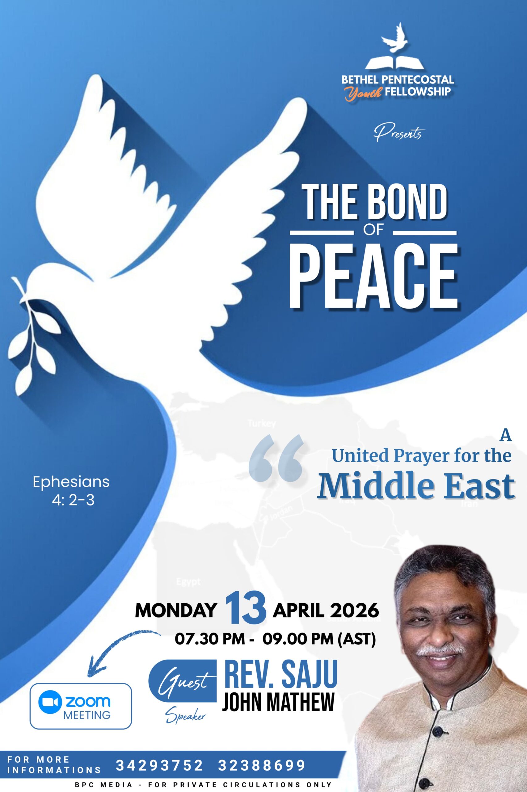 മനാമ: ബെഥേൽ പെന്തെക്കോസ്തൽ യൂത്ത് ഫെല്ലോഷിപ്പ് സംഘടിപ്പിക്കുന്ന “സമാധാനത്തിന്റെ ബന്ധം” (The Bond of Peace) എന്ന പ്രത്യേക പ്രാർത്ഥനാ സംഗമം 2026 ഏപ്രിൽ 13-ാം തീയതി തിങ്കളാഴ്ച വൈകുന്നേരം 7.30 മുതൽ 9.00 വരെ (AST) ഓൺലൈൻ ആയി (Zoom വഴി) നടക്കും.