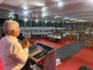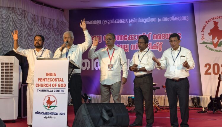 ഇന്ത്യ പെന്തക്കോസ്ത് ദൈവസഭ തിരുവല്ല സെൻ്റർ കൺവൻഷൻ നെടുമ്പ്രം ഗോസ്പൽ സെൻ്റർ ഗ്രൗണ്ടിൽ പാസ്റ്റർ ഡോ. കെ.സി. ജോൺ ഉദ്ഘാടനം ചെയ്യുന്നു. പാസ്റ്റർമാരായ അജു അലക്സ്, വിൽസൺ മത്തായി, ട്രഷറർ ജോജി ഐപ്പ് മാത്യൂസ്, പാസ്റ്റർ സി.പി.മോനായി എന്നിവർ സമീപം.