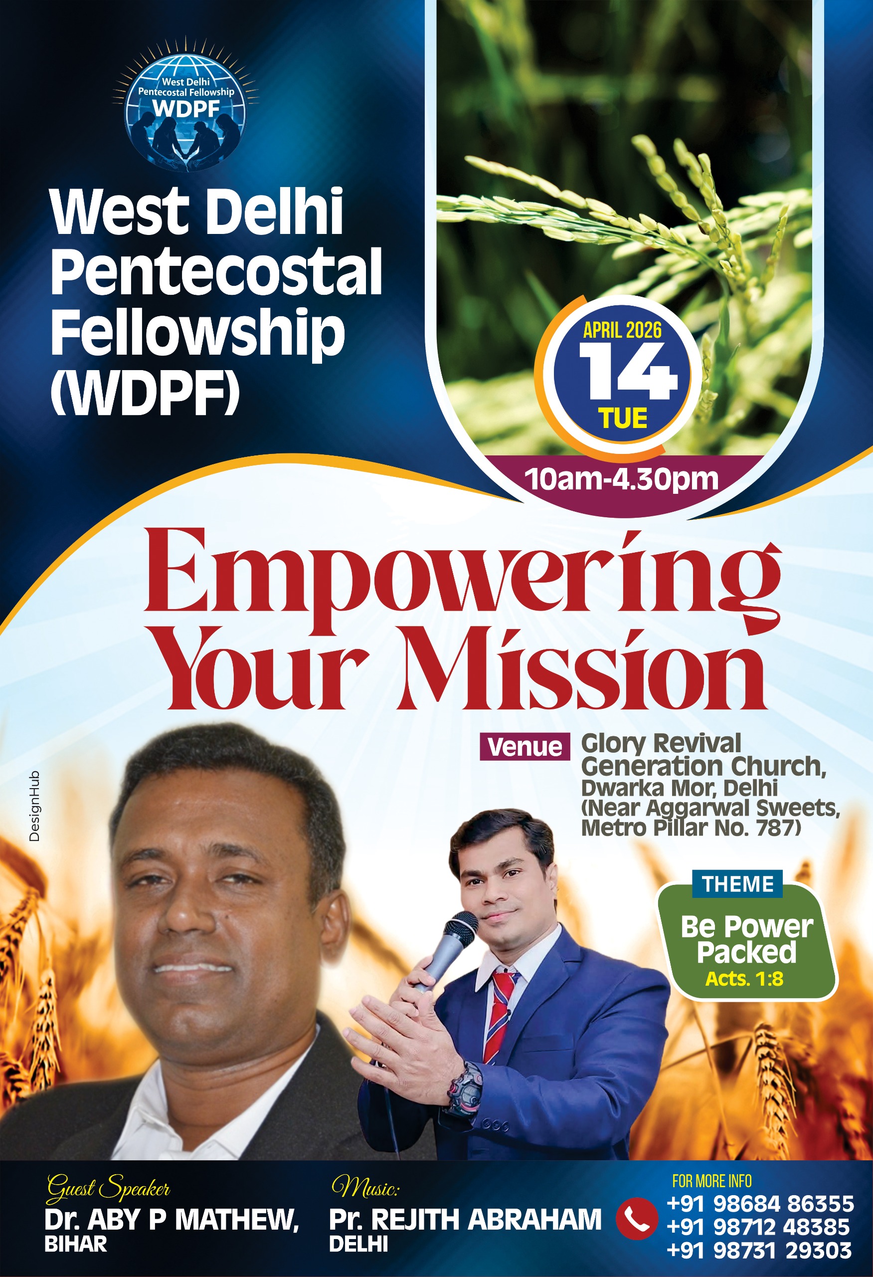 ഡൽഹി: വെസ്റ്റ് ഡൽഹിയിലുള്ള പെന്തെക്കോസ്തു സഭകളുടെ സംയുക്ത വേദിയായ വെസ്റ്റ് ഡൽഹി പെന്തെക്കോസ്തൽ ഫെല്ലോഷിപ്പ് (WDPF ) ഏകദിന മിഷൻ കോൺഫ്രൻസ് ഏപ്രിൽ 14 ചൊവ്വ രാവിലെ 10 മുതൽ വൈകിട്ട് 4.30 വരെ ദ്വാരക മോഡിലുള്ള (അഗർവാൾ സ്വീറ്റസിന് സമീപം, മെട്രോ പില്ലർ 787) ഗ്ലോറി റിവൈവൽ ജനറേഷൻ ചർച്ചിൽ വച്ച് നടക്കും. ശക്തിയാൽ നിറയുക (അപ്പൊ. 1:8) എന്നതാണ് ചിന്താവിഷയം. ഡോ. എബി പി മാത്യു ബീഹാർ സന്ദേശം നൽകും. പാസ്റ്റർ രെജിത് എബ്രഹാം ഗാനങ്ങൾ ആലപിക്കും. പ്രസിഡന്റ് പാസ്റ്റർ അജി മാത്യു, സെക്രട്ടറി ബ്രദർ സാബു മത്തായി, ട്രഷറർ ബ്രദർ സജി പി എബ്രഹാം എന്നിവരുടെ നേതൃത്വത്തിലുള്ള എക്സിക്യൂട്ടീവ് കമ്മിറ്റി ക്രമീകരണങ്ങൾക്ക് നേതൃത്വം നൽകും.