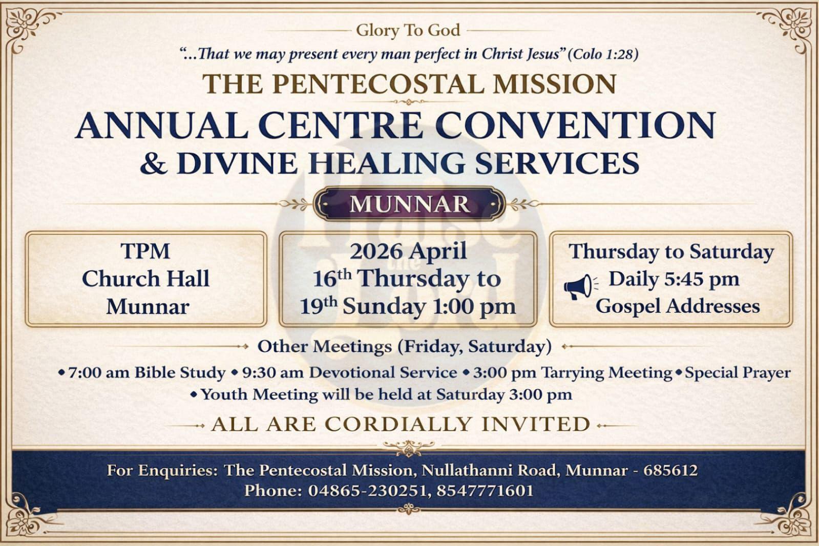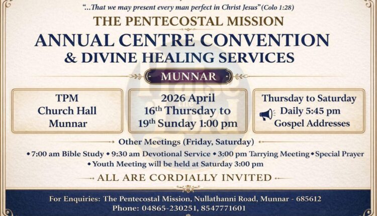 മൂന്നാർ: ദി പെന്തെക്കൊസ്ത് മിഷൻ മൂന്നാർ സെന്റർ വാർഷിക കൺവൻഷൻ ഏപ്രിൽ 16 വ്യാഴം മുതൽ 19 ഞായർ വരെ മൂന്നാർ നല്ലതണ്ണി റോഡിലുള്ള റ്റി.പി.എം ആരാധനാലയത്തിൽ വെച്ച് നടക്കും.