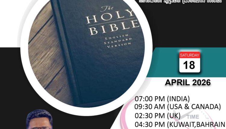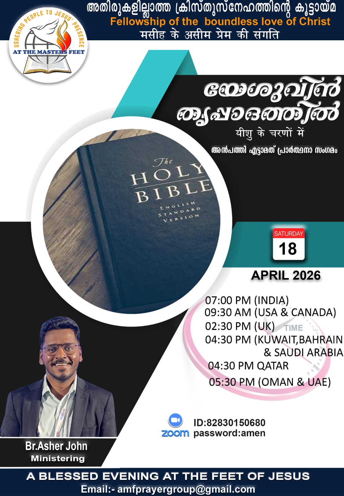 ദൈവവചനം അതിരുകളില്ലാതെ എല്ലാവരിലേക്കും എത്തിക്കുക എന്ന ലക്ഷ്യത്തോടെ സംഘടിപ്പിക്കുന്ന ”യേശുവിൻ തൃപ്പാദത്തിൽ” അൻപത്തി എട്ടാമത് പ്രാർത്ഥനാ സംഗമം ഏപ്രിൽ 18ന് ശനിയാഴ്ച രാത്രി 7.00ന് (ഇന്ത്യൻ സമയം) ഓൺലൈനിൽ നടക്കും. ക്രൈസ്തവ സംവാദ രംഗത്ത് ഈ കാലഘട്ടത്തിൽ ശക്തമായി ദൈവത്താൽ ഉപയോഗിക്കപ്പെടുന്ന Br. Asher John തൻറെ അനുഭവങ്ങളും മുഖ്യ സന്ദേശവും നൽകുന്നു.
