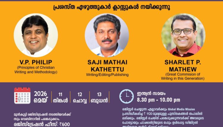 തിരുവല്ല: മീഡിയ മിഷന്റെ ആഭിമുഖ്യത്തിൽ 2026 മെയ് 11 മുതൽ 13 വരെ നവ എഴുത്തുകാർക്കും ക്രിസ്തീയ രചനയിൽ സജീവമാകുവാൻ ആഗ്രഹിക്കുന്നവർക്കുമായി പ്രത്യേക രചന ശില്പശാല സംഘടിപ്പിക്കുന്നു.