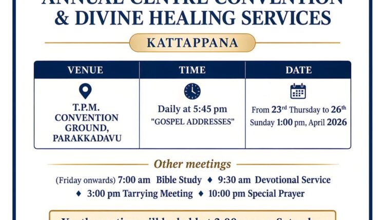 കട്ടപ്പന: ദി പെന്തെക്കൊസ്ത് മിഷൻ കട്ടപ്പന സെന്റർ വാർഷിക കൺവൻഷൻ നാളെ ഏപ്രിൽ 23 മുതൽ 26 ഞായർ വരെ പാറക്കടവ് റ്റി.പി.എം കൺവൻഷൻ ഗ്രൗണ്ടിൽ വെച്ച് നടക്കും.