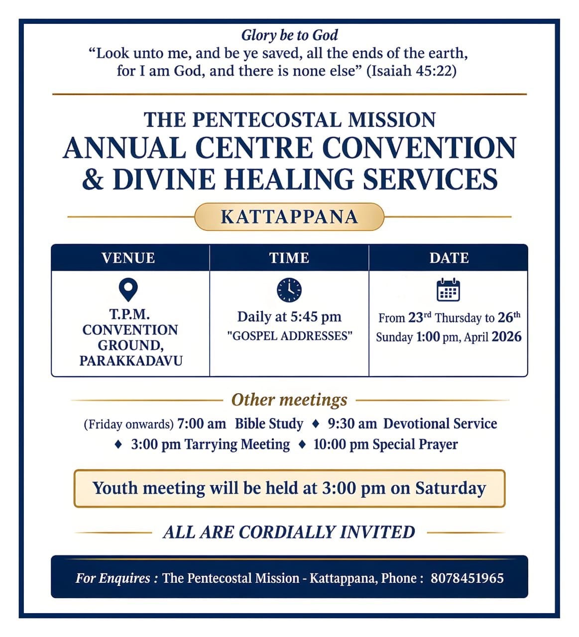 ദിവസവും വൈകിട്ട് 5.45 ന് സുവിശേഷ പ്രസംഗം. വെള്ളി, ശനി ദിവസങ്ങളിൽ രാവിലെ 7 ന് വേദപാഠം, 9.30 ന് പൊതുയോഗം, വൈകിട്ട് 3 ന് കാത്തിരിപ്പ് യോഗം, രാത്രി 10 ന് പ്രത്യേക പ്രാർത്ഥന എന്നിവയും ശനിയാഴ്ച വൈകിട്ട് 3 ന് യുവജന മീറ്റിങ്ങും നടക്കും. സമാപന ദിവസമായ ഞായറാഴ്ച രാവിലെ 9 ന് കട്ടപ്പന സെന്ററിലെ 20 ഓളം പ്രാദേശിക സഭകളുടെ സംയുക്ത സഭായോഗം നടക്കും.