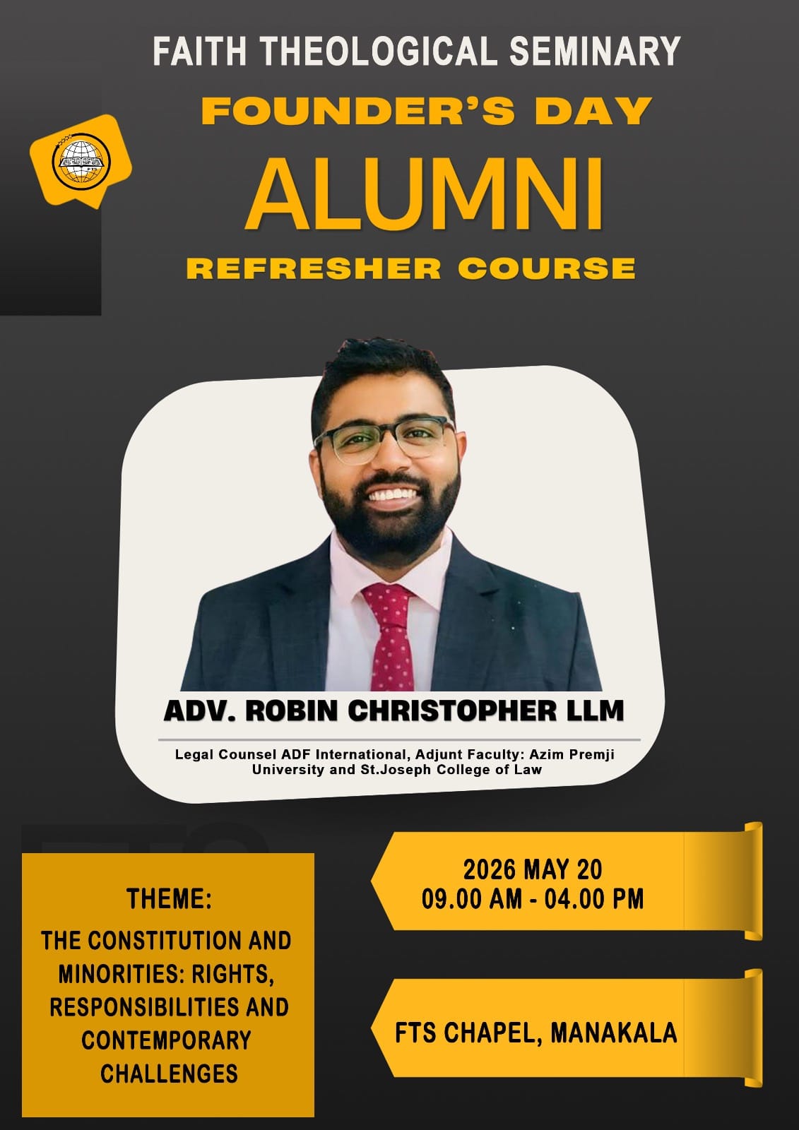 മണക്കാല: ഫെയ്ത്ത് തിയോളജിക്കൽ സെമിനാരിയുടെ ഫൗണ്ടേഴ്സ് ഡേയുടെ ഭാഗമായി അലുമ്നി റിഫ്രഷർ കോഴ്സ് സംഘടിപ്പിക്കുന്നു. മെയ് 20ന് രാവിലെ 9 മുതൽ വൈകുന്നേരം 4 വരെ എഫ്.ടി.എസ് ചാപ്പലിൽ നടക്കുന്ന പരിപാടിയിൽ അഡ്വ. റോബിൻ ക്രിസ്റ്റഫർ എൽ.എൽ.എം ക്ലാസ് നയിക്കും. എ.ഡി.എഫ് ഇന്റർനാഷണലിന്റെ ലീഗൽ കൗൺസലും അസിം പ്രേംജി യൂണിവേഴ്സിറ്റിയിലും സെന്റ് ജോസഫ് കോളേജ് ഓഫ് ലോയിലും അഡ്ജന്റ് ഫാക്കൽറ്റിയുമായ അദ്ദേഹം പ്രശസ്ത നിയമ വിദഗ്ധനാണ്. “ഭരണഘടനയും ന്യൂനപക്ഷങ്ങളും: അവകാശങ്ങൾ, ഉത്തരവാദിത്തങ്ങൾ, സമകാലിക വെല്ലുവിളികൾ” എന്ന വിഷയത്തെ ആസ്പദമാക്കിയാണ് ക്ലാസ് സംഘടിപ്പിക്കുന്നത്.