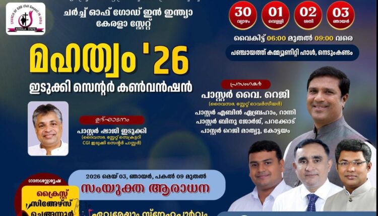 ഇടുക്കി നെടുംങ്കണ്ടം: ചർച്ച് ഓഫ് ഗോഡ് ഇൻ ഇന്ത്യാ കേരളാ സ്റ്റേറ്റ് ഇടുക്കി സെന്റർ കൺവൻഷൻ – മഹത്വം ’26 എന്ന പേരിൽ ഏപ്രിൽ 30 മുതൽ മെയ് 3 വരെ നെടുംകണ്ടം പഞ്ചായത്ത് കമ്മ്യൂണിറ്റി ഹാളിൽ നടക്കും. ഏപ്രിൽ 30ന് ഇടുക്കി സെന്റർ ശുശ്രൂഷകൻ കൂടിയായ ദൈവസഭ കൗൺസിൽ സെക്രട്ടറി പാസ്റ്റർ ഷാജി എം സ്കറിയാ കൺവൻഷൻ ഉദ്ഘാടനം നിർവഹിക്കും.